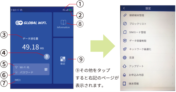①(データ通信量)が②(ご利用可能容量)に達すると、ホーム画面に『速度制限中』と表記され、通信速度が減速します。