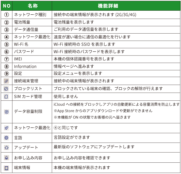 ・本機を再起動するとデータ容量制限はONになります。